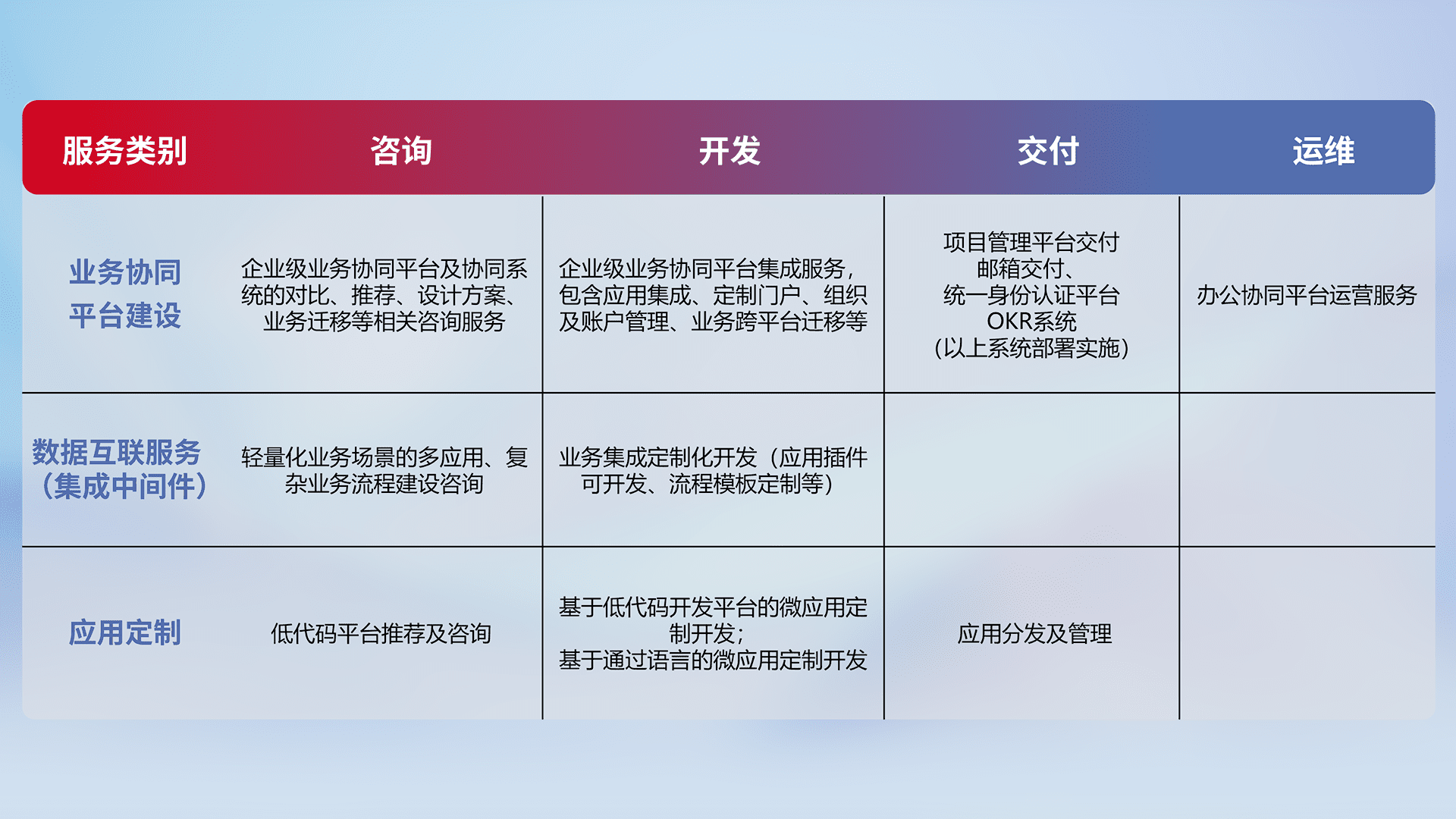 针对钉钉、、企微、、、、IDaas等平台级产品提供产品的规划、、、、方案、、交付、、定制化开发等服务,,,实现如统一协同办公、、、、智能客户服务、、混合会议管理、、、智能数据查询、、等业务场景,,实现数字化转型。。